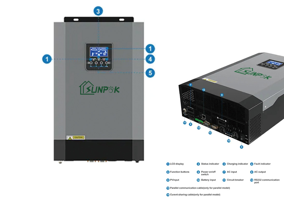 Sunpok 5Kwの単相高周波以外格子インバーターはLED表示と力なしで区域、不安定な力の遊牧的な区域、コミュニケーション基地局、区域、電池の製造業者の島、国境検問所、景色管理オフィス、新聞雑誌売店、電池のパック、等のために適している装備したり、支えるUSB/RS232/RS485/Bluetooth/Dry接触、コンパクト デザインおよびhigh-cost性能を。