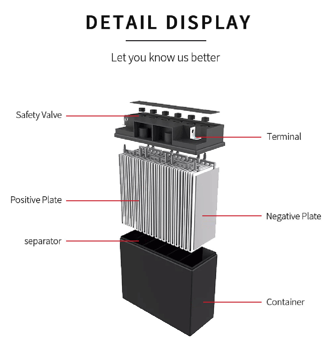 高められた安全:ゲル電池は心の安全と設計されている。密封された構造はそれらを屋内および屋外の取付けのために適したようにする酸の漏出かこぼれを防ぐ。ゲル電池は安全な、worry-freeエネルギー蓄積の解決を提供する。